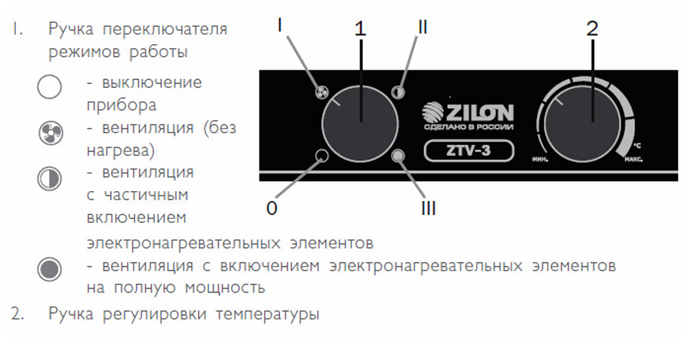 - Две ступени нагрева и режим вентиляции.