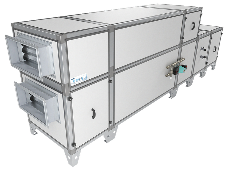 Приточно-вытяжная вентиляционная установка с рекуперацией и возможностью охлаждения воздуха в летний период. Имеет защиту от обмерзания рекуператора, обеспечивающую эффективную работу при температуре до -35°С. Комплектуется водяным калорифером, водяным охладителем, воздушными клапанами с электроприводом и возвратной пружиной, автоматикой с необходимыми датчиками и пультом. Может управлять канальным увлажнителем воздуха сигналом 0-10В или On/Off.